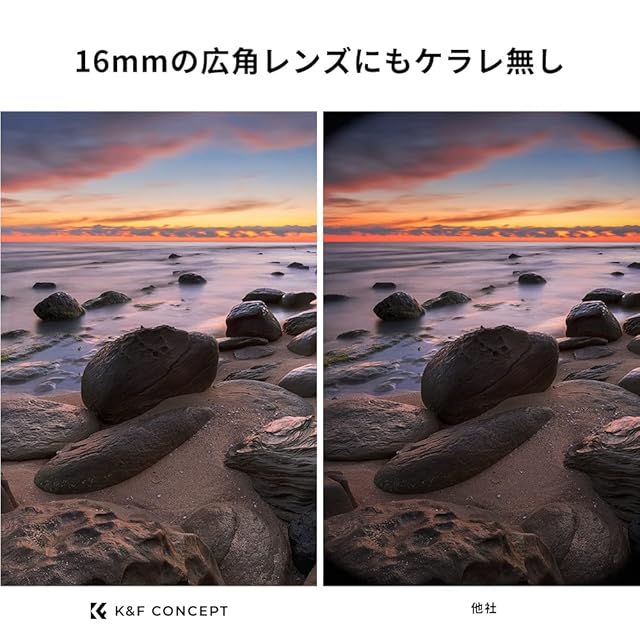 【注意事項】可変式NDフィルターは高段階側にあるとX状のムラが発生しやすくなります。ムラの位置は使用するレンズの種類や焦点距離によって異なります。フィルターを回転させ続けると、影が自然に消えます。この現象は品質の問題ではなく、可変NDの回転によって引き起こされる自然な物理現象です。