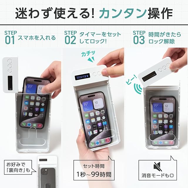 スマホをつい触ってしまう——そんな悩みに終止符を。指定した時間スマホをロックすることで、集中力アップやスマホ依存からの脱却をサポートする画期的なタイムロッキングコンテナ。最大99時間まで自由に設定可能で、図書館や自習室でも使いやすい消音モード&コンパクト設計。万が一の緊急時には、最大5回までの緊急解除機能も搭載。日本企画・全品検品の安心品質で、30日間の付き。初めての方も不安なくお使いいただけます。