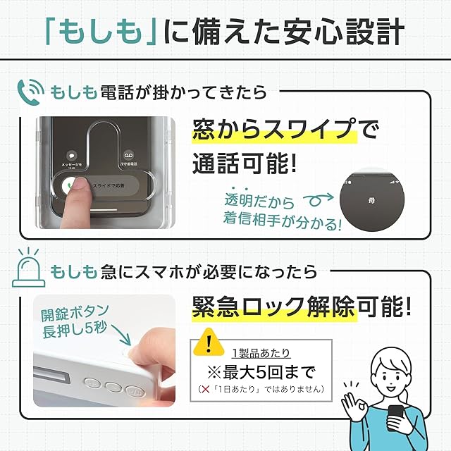【突然スマホが必要な時も大丈夫◎】緊急時に備えた解除機能付き。最大5回まで使用可能なので、いざという時も安心です。(不要な方は、あえて最初に使い切るのもオススメ♪)