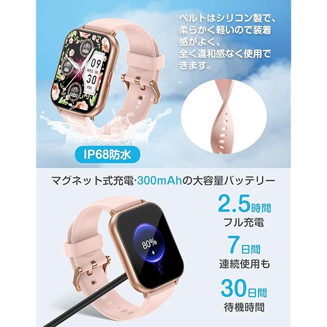 【カスタマイズ文字盤・豊富な機能を搭載】 280種類以上の文字盤デザイン——クラシック、シンプル、クール、かわいいものが揃っています。気分や服装に合わせて時計の文字盤を変えることができ、1日に新鮮さと活力を与えてくれます。このほかオリジナルダイヤルを指定でき、ペットや家族など好きな画像をダイヤルに設定できます。毎日を幸せにします。ストップウォッチ、タイマー、懐中電灯、音楽コントロール、目覚まし時計、座りがちリマインダー、女性の月経周期記録、腕上げ点灯、スマホを探す、明るさ調整など毎日のニーズに応える機能が充実しています。