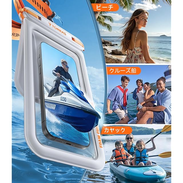 商品名:TORRAS スマホ 防水ケース【国際 IP68 認証・お風呂小物収納ポケット・JUBF大会協賛製品】 水に浮く ぼうすい ストラップ付き 首かけ 顔認証 高透過率画面 夏に不可欠 海 プール 温泉 雨などに 携帯防水ケース 7インチ以下スマホ対応 FlowPockets ホワイト