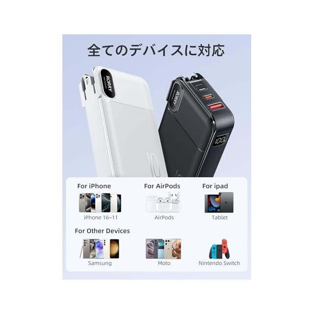 商品名:RORRY【モバイルバッテリー コンセント一体型 10000mAh PD22.5W】ACプラグ付き 携帯バッテリー 4台同時充電 ディスプレイ搭載 折畳みプラグ 2本ケーブル内蔵(USB-C&iPhone用ケーブル)PSE認証済 ポータブル式 for iPhone/Android/AirPods 旅行/防災/台風/飛行機 ホワイト