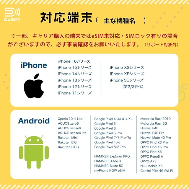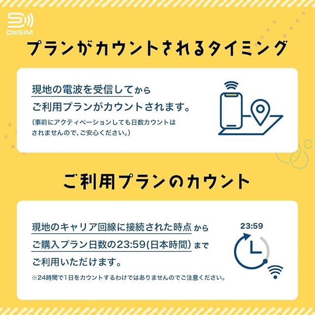 【設定簡単!】QRコードをスキャンして、簡単接続!✅QRコード交換:ご購入後、http://jp.desim.tech/ にアクセスし必要事項を入力→メールアドレスにPDFの説明書と設定用のQRコードが届きます! 【4G / LTE高速通信】高速インターネット通信可能! 手間要らずのSIMで快適な旅行を 【LINE日本語安心サポート】トラブルがあった場合もLINEで簡単問い合わせが可能!(主要問い合わせ時間:平日10時-19時) すぐ利用したい方:お急ぎのお客様はすぐご利用いただけるようご案内を致しますので、LINEでお問い合わせください。 注意事項①:電話番号は付与されませんので、ご注意ください。 注意事項②:SIMロックフリー端末、もしくはSIMフリー端末専用のサービスです。必ず、ご利用端末がeSIM対応かどうかご確認ください。 注意事項③:2021年10月1日以前にSIMロック解除をキャリア店頭またはインターネットでされた「Android端末」はご利用いただけない可能性があります。 こちらもし繋がらない場合、端末の問題により、 返品・返金等の対応は行っておりませんので、 事前にご確認の上、ご購入ください。 注意事項④:最新のOSバージョンでないと、ご利用いただけない場合がございます。事前にアップデートをお願いいたします。 注意事項⑤:本商品は、利用可能国および地域以外ではご利用いただけません。 注意事項⑥:回線状況により、エリアによって接続できない可能性もございます。エリア起因によるキャンセルはできませんので、ご了承の上ご購入ください。 注意事項⑦:利用有無に問わず一度削除したeSIMは、再インストールできません。また、一度読み込んだQRコードは他の端末で読み込むことができません。※万が一エラーとなった場合も削除せず、弊社カスタマーセンターまでお問い合わせください。 【返品等】当店では下記の内容につきましては対応できませんので、ご了承下さい。①ご購入後7日経過のSIM返品 ②SIMロック未解除による利用不可. ③パッケージ開封後のSIM返品. ④お客様設定ミスによるローミング料金