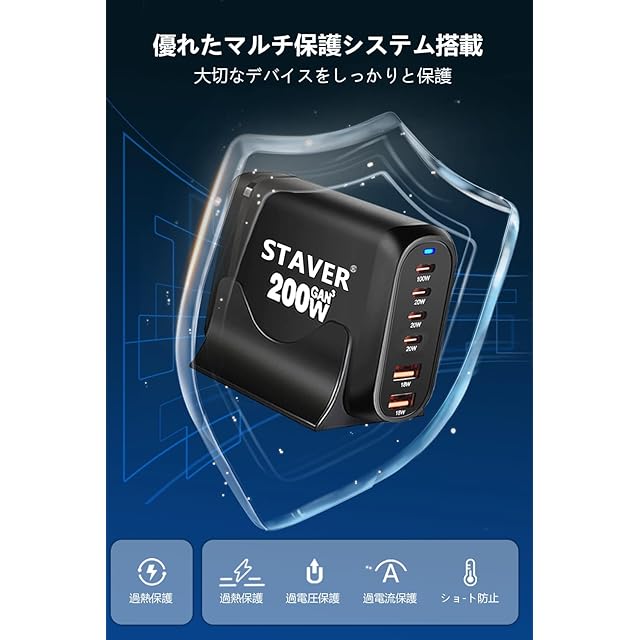 商品名:200W 充電器 【GaNFastⅢ 6ポート 単口最大100W 1.5m電源ケーブル 】【PSE技術基準適合】 PD3.0対応 6ポート4 USB-C&2 USB-A GaNFastⅢ(窒化ガリウム) 単一ポート100W常時対応 複数ノートPCに急速充電対応 MacBook Pro PD対応Windows PC/iPad/iPhone/Android/その他 (ブラック)