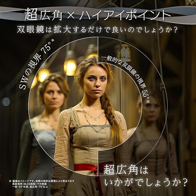 【超広角 × ハイアイポイントで唯一無二の感動体験!】これまでの「超広角双眼鏡」は、アイレリーフ(目とレンズの距離)が短く、広角ではない双眼鏡と比べると覗きにくい設計となっていました。「超広角視界をもっと快適に楽しんでいただきたい」そんな想いを実現するために、SW10×25WPは光学設計を工夫し、超広角とロングアイレリーフを両立しました。SW10×25WPを覗くと、まるですぐそこにステージや舞台があるかのような、リアルな世界観に没入できます。超広角のため、コンサートはもちろん、歌劇やミュージカルなどにもぴったり。さらに、アウトドアや野外フェスでも安心の防水設計。唯一無二の感動体験、超広角によるあなただけの特別な視界をお楽しみください。