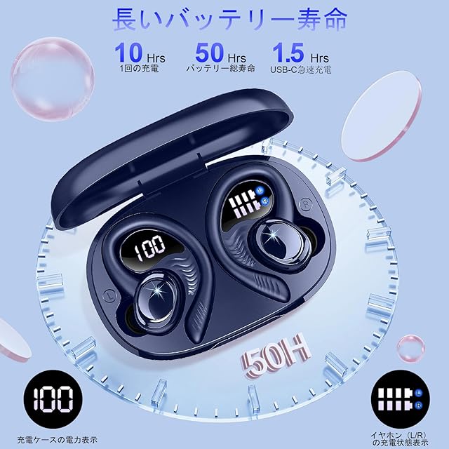 商品名:イヤホン bluetooth ワイヤレスイヤホン 2025 Bluetooth 5.4 瞬時接続 自動ペアリング 最大50時間再生 ブルートゥースイヤホン 耳掛け式 耳を塞がない Hi-Fi音質 4つのマイク付き ENCノイズキャンセリングイヤホン IPX7防水 LEDディスプレイ Type-C充電 通学/通勤/スポーツ (ダークブルー)