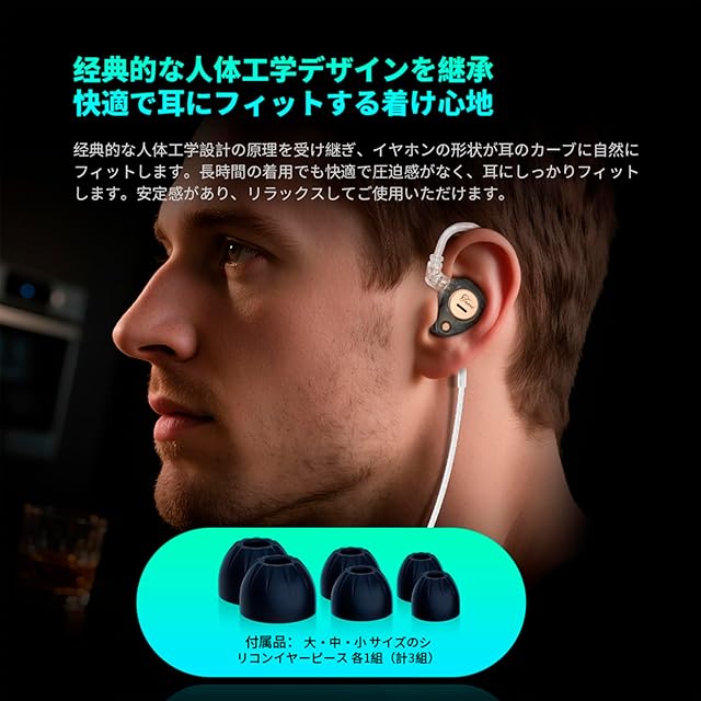 【長時間装着でも疲れない人間工学設計】 :軽量ボディと耳になじむカーブ形状で、長時間使用でも圧迫感を軽減。KZ Taurus イヤホン 有線 カナル型 はS/M/Lサイズのシリコンイヤーピース付属で、個人の耳形状に合わせた最適なフィット感を提供。激しい動きでも外れにくい安定性を備えています。