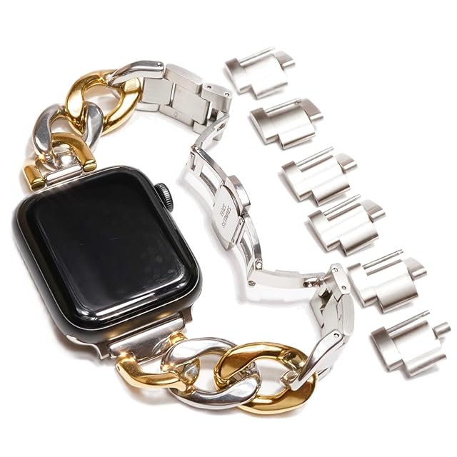 【全機種対応】対応機種:Apple Watch Series 11 , 10 , 9 , 8 , 7 , 6 , 5 , 4 , SE ,Ultra 3.2.1 /サイズ:40 . 41 . 42 . 44 . 45 . 46 . 49mm対応 / ご希望のサイズをお選びください。 / 付属品:輸送用ボックス、コマ調整説明書 ※アップルウォッチ本体は付属しません。※ゴールドカラー、ピンクゴールドカラーはチェーンが重なり合う部位は塗装が薄れシルバーに近い色味となりますが、不良品ではございません。装着時には露出しない部位となります。【高級感溢れるバンドで華やかに】チェーンベルトがキラキラ輝くデザインで、一段と上品な雰囲気を演出します。手首につけるだけでオシャレ度がグッと上がり、着けていても違和感のない重さなので、ビジネスからカジュアルな場面まで幅広いシーンでお使いいただけます。【装着も楽々】高級時計にも用いられるバタフライバックルを採用。ベルト側面のボタンを押すだけで片手でもスマートに開閉でき、スピーディーに着脱できるので忙しい朝でもサッと着用可能です。使い勝手抜群なので、爪が柔らかい方やジェルネイルも傷つける心配がありません。【ステンレススチールを採用】合金ではなくステンレススチールを用いたチェーンブレスレット。ステンレススチールの磨き上げられた美しいデザインが特徴で、チェーンはポリッシュ加工、コマは高品質サテンで仕上げています。リング状のチェーンは通気性も抜群です。【コマ調整器が不要】コマ調整器がいらず、コマを引っ張って捻るだけで簡単に調節が出来ます。ベルトの裏面を矢印の方向へコマを引っ張り、回転させることでコマが外れます。※取り扱い説明書付き【必ずお読みください】 1.ステンレスは金属アレルギーを起こしにくい素材ですが、体質によって、かゆみ・かぶれを生じる場合がありますので、皮膚に異常を感じたときは、ご使用をお止めいただき専門医にご相談ください。金属アレルギーが心配な方は、皮膚科にてパッチテストなどのアレルギーテストを受けられることをおすすめします。?ご購入後のアレルギー反応に関しまして責任は一切お受け出来かねます。あらかじめ、ご了承ください。金属アレルギーの方はご使用しないで下さい。 2.力仕事や激しいスポーツをする時、就寝時や幼児の世話をする時など、身体に危害を及ぼす場合がありますのでジュエリーをはずしてください。 3.サウナ等高温の場所、あるいはスキー場等極寒地でのピアスなどのジュエリーの使用は、火傷、凍傷の原因となる場合がありますので、着用しないでください。