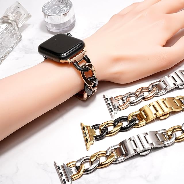 【全機種対応】対応機種:Apple Watch Series 11 , 10 , 9 , 8 , 7 , 6 , 5 , 4 , SE ,Ultra 3.2.1 /サイズ:40 . 41 . 42 . 44 . 45 . 46 . 49mm対応 / ご希望のサイズをお選びください。 / 付属品:輸送用ボックス、コマ調整説明書 ※アップルウォッチ本体は付属しません。※ゴールドカラー、ピンクゴールドカラーはチェーンが重なり合う部位は塗装が薄れシルバーに近い色味となりますが、不良品ではございません。装着時には露出しない部位となります。【高級感溢れるバンドで華やかに】チェーンベルトがキラキラ輝くデザインで、一段と上品な雰囲気を演出します。手首につけるだけでオシャレ度がグッと上がり、着けていても違和感のない重さなので、ビジネスからカジュアルな場面まで幅広いシーンでお使いいただけます。【装着も楽々】高級時計にも用いられるバタフライバックルを採用。ベルト側面のボタンを押すだけで片手でもスマートに開閉でき、スピーディーに着脱できるので忙しい朝でもサッと着用可能です。使い勝手抜群なので、爪が柔らかい方やジェルネイルも傷つける心配がありません。【ステンレススチールを採用】合金ではなくステンレススチールを用いたチェーンブレスレット。ステンレススチールの磨き上げられた美しいデザインが特徴で、チェーンはポリッシュ加工、コマは高品質サテンで仕上げています。リング状のチェーンは通気性も抜群です。【コマ調整器が不要】コマ調整器がいらず、コマを引っ張って捻るだけで簡単に調節が出来ます。ベルトの裏面を矢印の方向へコマを引っ張り、回転させることでコマが外れます。※取り扱い説明書付き【必ずお読みください】 1.ステンレスは金属アレルギーを起こしにくい素材ですが、体質によって、かゆみ・かぶれを生じる場合がありますので、皮膚に異常を感じたときは、ご使用をお止めいただき専門医にご相談ください。金属アレルギーが心配な方は、皮膚科にてパッチテストなどのアレルギーテストを受けられることをおすすめします。?ご購入後のアレルギー反応に関しまして責任は一切お受け出来かねます。あらかじめ、ご了承ください。金属アレルギーの方はご使用しないで下さい。 2.力仕事や激しいスポーツをする時、就寝時や幼児の世話をする時など、身体に危害を及ぼす場合がありますのでジュエリーをはずしてください。 3.サウナ等高温の場所、あるいはスキー場等極寒地でのピアスなどのジュエリーの使用は、火傷、凍傷の原因となる場合がありますので、着用しないでください。