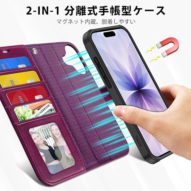 商品名:TUCCH iPhone 17 対応 ケース 手帳型 2 in 1 分離式 6.3インチ ストラップ付き 取り外し可 RFIDブロッキング 4つカードポケット ストラップホール 横置きスタンド機能 衝撃吸収 全面保護 PU合皮 あいふぉん17対応携帯ケース 2025年発売 5G プラムパープル