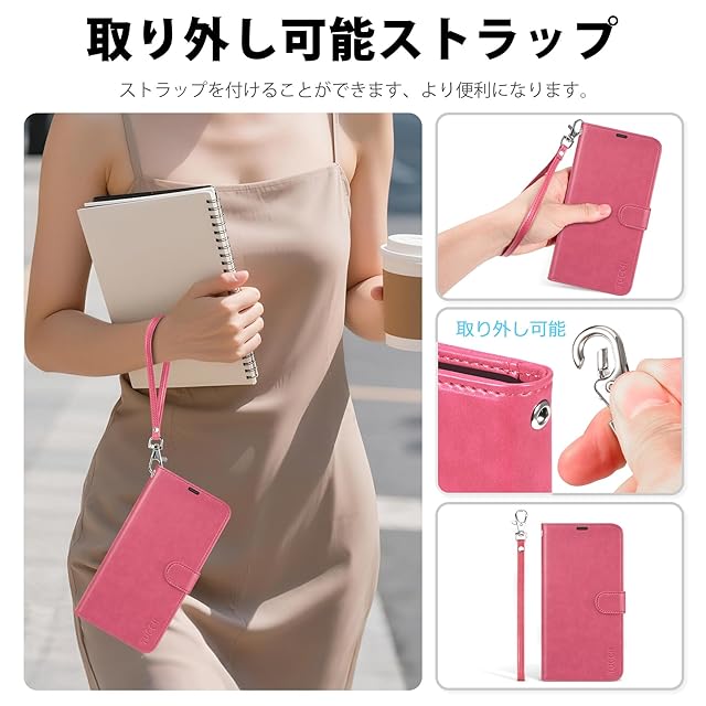 【2 in 1分離型&ストラップ付き】手帳型ケースとインナーケースは磁力で吸着され、用途に応じて簡単に取り外しが可能です。手帳型にも背面カバーにもなる便利な2in 1分離型ケースです。背面カバー単体として使用する際は、ワイヤレス充電に対応しています。手帳型ケースの上部にはストラップホールがあり、ストラップを手首に通せば、落下の心配もありません。背面カバーの下部にも縄用穴があり、お好きな縄を付けることができます。ご注意:付属のストラップは背面カバーの穴には使用できません。