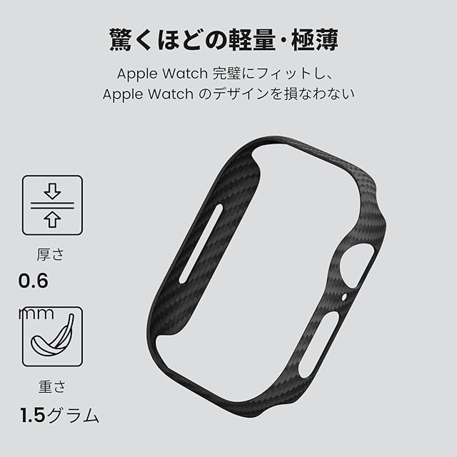 【贅沢な素材】航空宇宙や軍用分野でも採用される高強度なアラミド繊維を使用しています。この素材は、非常に軽量でありながら優れた耐衝撃性と耐摩耗性を持ち、日常の衝撃やキズからウォッチをしっかり保護します。特選の600Dアラミド繊維から織られたアラミドクロスを真空成型して、Apple Watch 11用カバーとApple Watch 10用ケースを成型させた後、コーティングやエッジの処理などをします。アラミド繊維でPITAKA Apple Watch ケースを仕上げるまでに、約30プロセスが必要となっています。