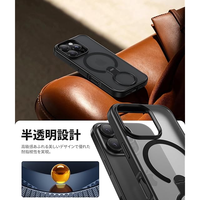 NIMASO iPhone 16pro ケース【米軍MIL規格 MagSafeアクセサリー対応 360°回転スタンド 横縦両立 指紋防止】 落下防止 耐衝撃 いphone 16 pro 用 半透明 ワイヤレス充電対応 アイフォン16pro用 ケース 6.3インチ 磁吸強化(黒羽シリーズ)ブラック DSC25D1597