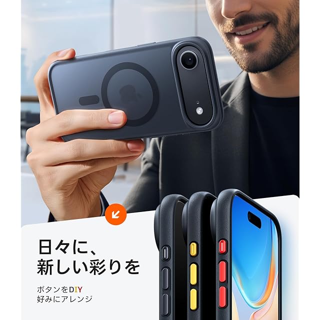 【撮影もカスタムも自由自在!カメラ保護ボタン】カメラコントロールボタンには4層素材を採用し、感度と保護性を両立。日常の撮影も安心で快適です。さらに、多色DIYボタンと下部のストラップホールで、気分やスタイルに合わせて自分だけのスマホケースをデザイン可能。対応機種:For iPhone air ケース
