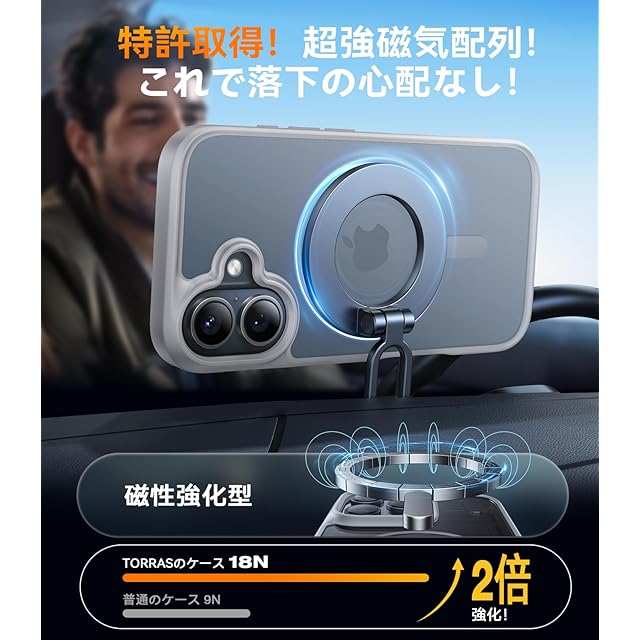 【本当!? 特許取得のマグネット!これが驚異の安定性!】軽く吸着し、瞬時に強力かつ精密にフィットする!TORRAS特許技術に基づく N52 マグネットは最適な配列で設計されており、他のケース磁石と比べて 40%も強い。ワイヤレス充電から車載ホルダーまで、幅広いMagSafe アクセサリーと簡単に互換性がある。どんな揺れにも強く、しっかり固定されるから、簡単には外れない!対応機種:iPhone 16 用 ケース
