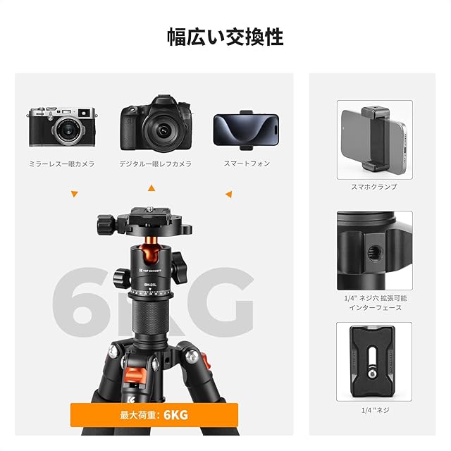 頑丈で丈夫:三脚はアルミニウム合金製で、頑丈で耐久性があります。 三脚の最大耐荷重は6kgです。