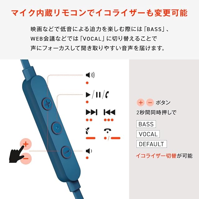イヤホン本体のリモコン部分で操作する「BASS」「VOCAL」「DEVAULT」の3種のプリセットイコライザーを搭載。