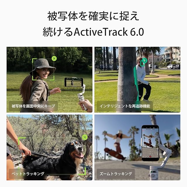 ✅[アップグレードしたActiveTrack 6.0で対象を中心に] - 最新のトラッキング技術により、被写体を選択すると、ジンバルが自動でジンバルをトラッキング。素早くダイナミックな動きで撮影したり、被写体が何かで遮られたりしても、トラッキングを継続します。