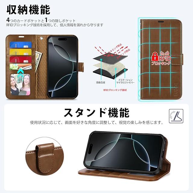 <p><strong>品質よいの合皮</strong></p><p> TUCCH iPhone17 ケース手帳型は革の風合いを求めて、上質合皮を採用しています。色合い、光沢感、質感、肌触りなどから見て、本革に迫ると言えます。ブランドロゴだけの飾りは日常に馴染む自然なデザインに仕上げます。</p><p> </p><p><strong>耐久性に富むTPU</strong></p><p>iPhone 17 ケース本体を嵌めるプラスチック部分は耐久性と弾力性に富むTPU素材を採用します。割れることはなく、衝撃から本体をしっかり保護します。 </p><p> </p><p><strong>多機能な手帳型ケース</strong></p><p> <strong>1.カード収納</strong></p><p> 必要な場合、カードを二三枚入れて、おサイフケータイのように利用できます。</p><p><strong> 2.スタンド機能</strong></p><p> 使用状況に応じて、画面の角度を自由に調整できます。フラップは後ろの蓋にも吸着でき、邪魔なく、いつでもどこでもニュースをサクサク読めます。</p><p> <strong>3.RFIDブロッキング技術を活用</strong></p><p> この商品は、Radio Frequency Identification (RFID)ブロックテクノロジーを採用して、リモートスキャンによって、ICカードなどの個人情報を漏れから守ります。</p><p><strong> 4.2重構造-2重保護</strong></p><p> PU + TPUの組み合わせは耐衝撃、耐久性、抜群な放熱性を持っています。そして、ケースの四隅に、それぞれ衝撃吸収できるエアークッションがあり、落下時の場合、本体への衝撃を抑えて、保護性能をさらにアップします。</p><p><br></p><p><strong> 購入前のご確認:</strong></p><p> 1.この商品は2025年発売のiPhone 17 に対応します、ほかの機種に対応しません。 </p><p> 2.RFIDブロッキング技術を採用したので、カードを入れたまま、反応しないことがあり、カードを出して利用したほうがいいです。</p>