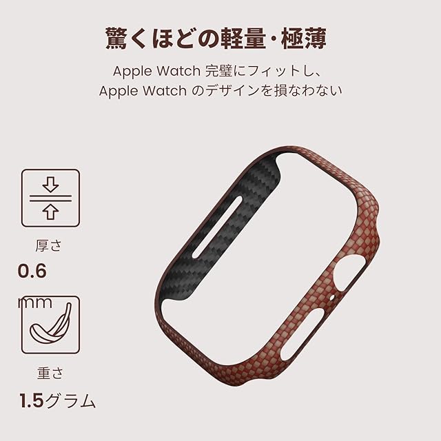 【贅沢な素材】航空宇宙や軍用分野でも採用される高強度なアラミド繊維を使用しています。この素材は、非常に軽量でありながら優れた耐衝撃性と耐摩耗性を持ち、日常の衝撃やキズからウォッチをしっかり保護します。特選の600Dアラミド繊維から織られたアラミドクロスを真空成型して、Apple Watch 11用カバーとApple Watch 10用ケースを成型させた後、コーティングやエッジの処理などをします。アラミド繊維でPITAKA Apple Watch ケースを仕上げるまでに、約30プロセスが必要となっています。