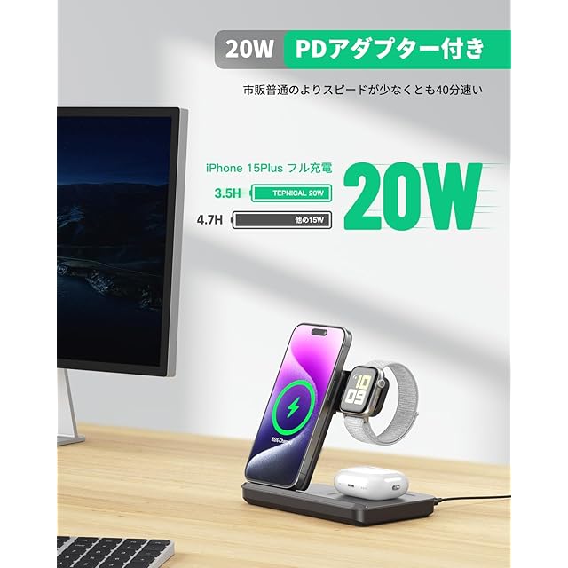 商品名:【2025昇進型】TEPNICAL ワイヤレス充電器 3 in 1急速充電 折り畳み式 スタンド 置くだけ 15W/10W/7.5W iPhone 16/15/14/13/12シリーズ対応/Galaxy/Note/Apples iWatch など対応 20W PDアダプター付属 ブラック