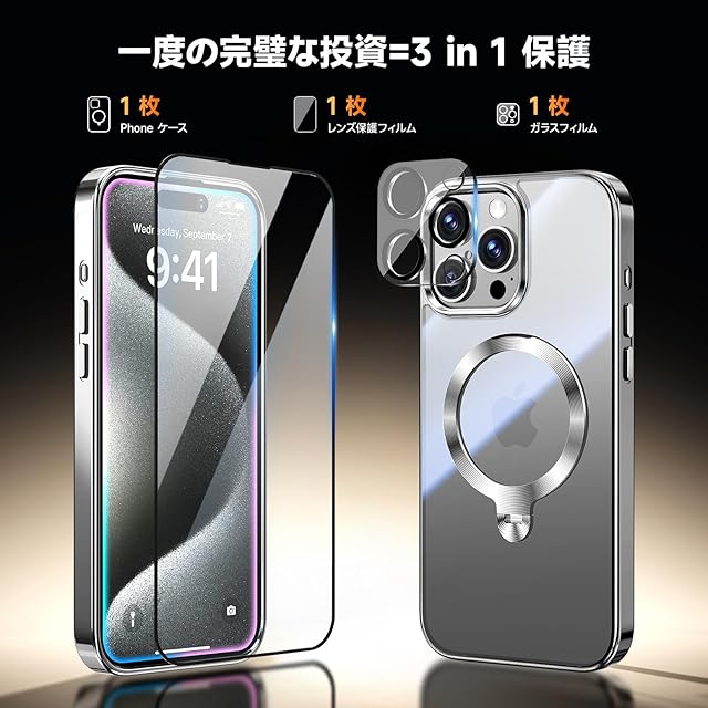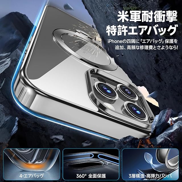 商品名:【三重保護セット!上品なメタリック光沢】OYR iPhone 15 Pro Max 用 クリア ケース Magsafe 対応[360°回転CD スタンド・10 万回開閉テスト][メッキバンパー・iPhone専属色][カメラ保護とガラスフィルム付き]ストラップホール付き マグセーフ アイホン15プロマックスケース マホケース15 Pro Max 米軍MIL規格取得・耐衝撃(6.7“チタングレー)