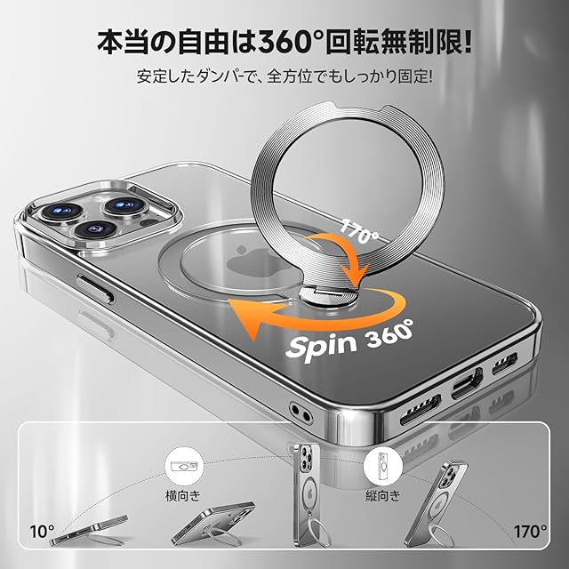 【360°回転!|耐久性・安定性・高級感全て揃えた】 市販品にありがちな「変形」、「緩み」、「安定性がない」などの悩みを、新しい製品にフィードバックして全ての問題を解消した!このiphone 15 promax ケース独自の技術を搭載し、10 万回以上の耐久テストをクリア。材質・形状・加工技術に徹底的にこだわり、市販品に比べて約10倍の圧倒的な耐久性と強度を実現したことにより、リングの部分緩みや破損も一気に解消!このiphone 15 promaxケースは縦 45° 直立から横 180° まで角度自在に調節できる。市販のスタンドが横置きを調整できず欠点を完全に解消しました!動画再生やビデオ通話などで、自分好みの角度に簡単に設定できます。カフェで集中作業する際、60° 傾けて iPhone を立てると、レポート作成中でもスマホでメール確認が両立。