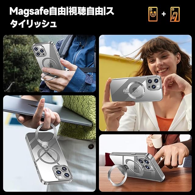 【三重保護セット!永久黄変防止】OYR iPhone 15 Pro Max用クリア ケース Magsafe 対応[360°回転CD スタンド・10 万回開閉テスト][メッキバンパー・iPhone専属色][カメラ保護とガラスフィルム付き]ストラップホール付き マグセーフ アイホン15プロマックスケース マホケース15 Pro Max 人気 米軍MIL規格取得・耐衝撃(6.7インチ・チタングレー)