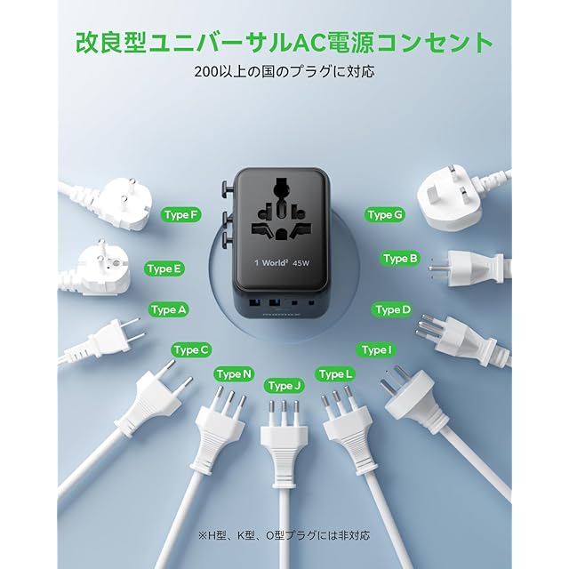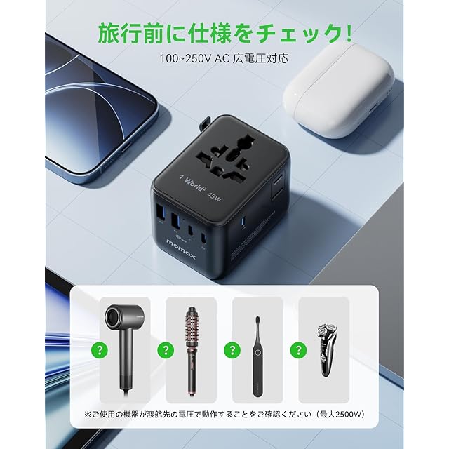 商品名:【最新登場! 45W急速充電】MOMAX 変換プラグ PD 45W GaN 急速充電 海外旅行用電源変換 7台同時充電 3*USB-C PD & 2*USB-A QC &2*ACコンセント 2個AC差込口 海外用コンセント C/BF/O/Aタイプ マルチ変換プラグ 全世界対応 ヨーロッパ/韓国/イギリス/アメリカ/オーストラリア 旅行便利グッズ