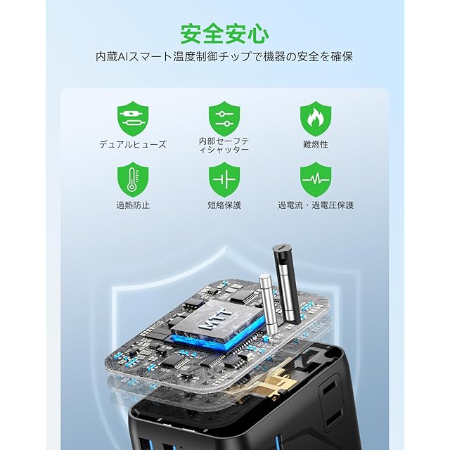 【安全な設計で安心にお使いいただけます】MOMAXのマルチ変換プラグはROHS、CEおよびFCC認証済みです。GaN冷却と耐火PC素材に加えて、マルチ保護機能搭載(過熱、過電流、過充電、短絡防止、過電力保護、過電圧保護、過放電保護)また10Aヒューズが内蔵されてありますので、使用中の安全性を保障します。