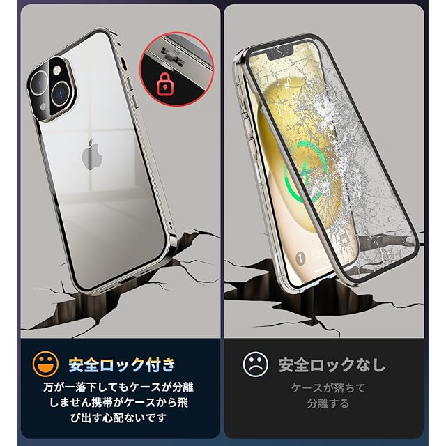 【両面9H強化ガラス・高感度タッチ】このiPhone15 ケースは、9H硬度ガラス素材を採用されて、鍵やカッターなどの鋭利なもので切りつけてもキズが付きにくく、耐衝撃性と耐傷性に優れています。両面9H強化ガラス + ロック機能付きメタルフレームの組み合わせにより、落下保護が向上し、iPhone15を全方位からしっかりと守れます。前カバーの画面、3Dタッチ機能により、応答性能が優れています。特殊コーティング技術でスムースな指すべりで操作性アップでゲームをしても楽しめます。★注意:画面保護フィルムを貼ってる必要はありません、操作反応が低下します。