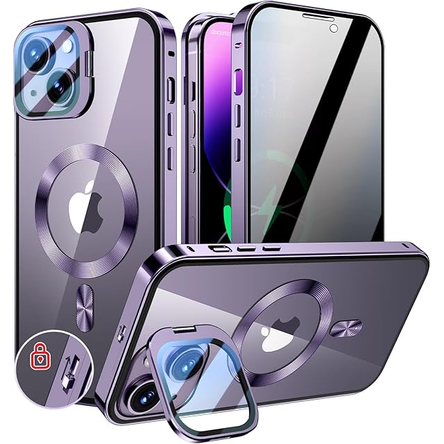KELLCASE【カメラレンズ保護・スタンド+覗き見防止+MagSafe対応 】iPhone 14 用 ケース 全面保護 隠しスタンド付き ロック付き 両面 マグネット式 アイフォン 14 カバー ストラップホール付き透明背面 メタルフレーム 磁石 ワイヤレス充電対応 9H強化ガラス 高感度タッチ あいふぉん14 用 ケース 6.1インチ(パープル)