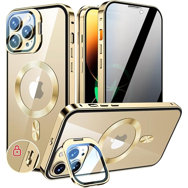 KELLCASE【カメラレンズ保護・スタンド+覗き見防止+MagSafe対応 】iPhone 14 Pro Max 用 ケース 全面保護 隠しスタンド付き ロック付き 両面 マグネット式 アイフォン14プロマックス カバー ストラップホール付き透明背面 メタルフレーム 磁石 ワイヤレス充電対応 9H強化ガラス 高感度タッチ あいふぉん14 promax 用 ケース 6.7インチ(ゴールド)