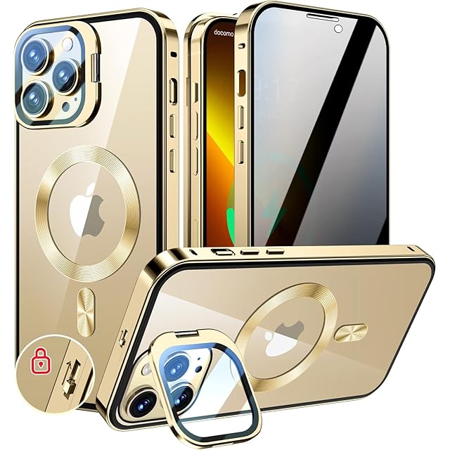 KELLCASE【カメラレンズ保護・スタンド+覗き見防止+MagSafe対応 】iPhone 13 Pro Max 用 ケース 全面保護 隠しスタンド付き ロック付き 両面 マグネット式 アイフォン13プロマックス カバー ストラップホール付き透明背面 メタルフレーム 磁石 ワイヤレス充電対応 9H強化ガラス 高感度タッチ あいふぉん13 promax 用 ケース 6.7インチ(ゴールド)