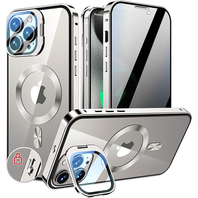 KELLCASE【カメラレンズ保護・スタンド+覗き見防止+MagSafe対応 】iPhone 15 Pro 用 ケース 全面保護 隠しスタンド付き ロック付き 両面 マグネット式 アイフォン15プロ カバー ストラップホール付き透明背面 メタルフレーム 磁石 ワイヤレス充電対応 9H強化ガラス 高感度タッチ あいふぉん15pro 用 ケース 6.1インチ((グレー)