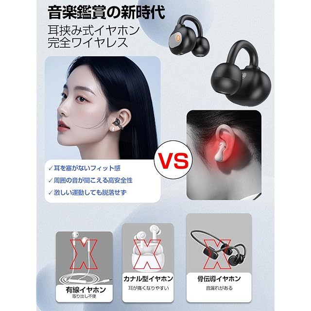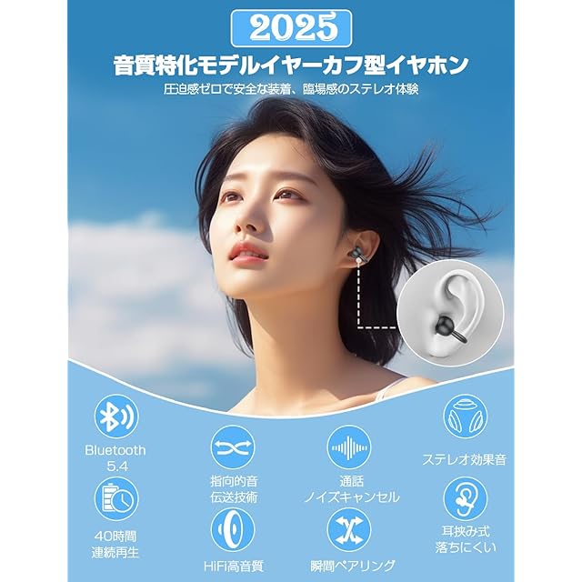商品名:イヤホン bluetooth ワイヤレスイヤホン【音質重視モデル 究極フィット イヤーカフ型】 Bluetooth5.4 オープンイヤー ゼロ圧迫設計 臨場感あふれるリアル 耳挟み式 定向音伝送技術 骨伝導の革新 残量可視化 通話ノイズキャンセル 音漏れ防止 脱落しにくい 最大 40時間の連続再生 自動ペアリング Type-C高速充電 iOS/Android対応