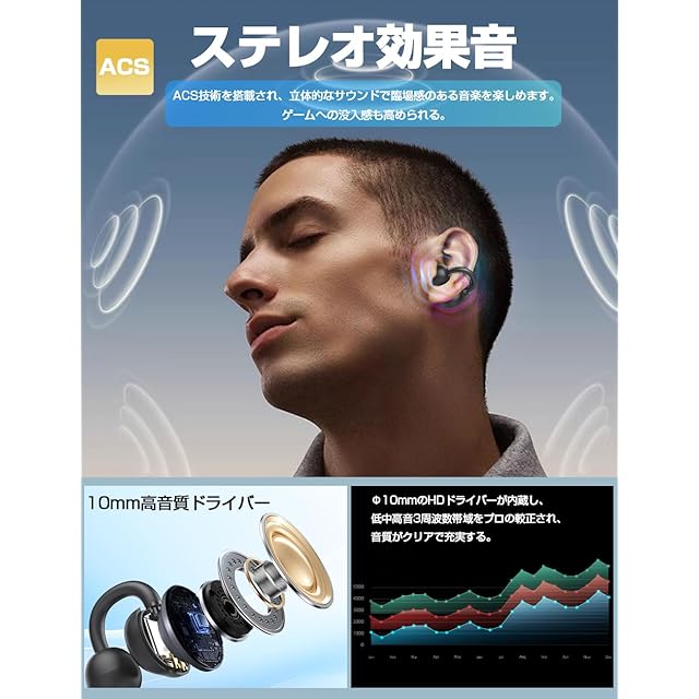【音質表現に特化したモデル&操作簡単のタッチセンサー】10mm ドライバーを内蔵するこのイヤーカフ型イヤホンは、低音から高音までバランスよく再現でき、耳を塞がない設計でありながら、優れた音質パフォーマンスを実現し、クリアな立体音を届けます。オープンイヤー深い没入感を持った音楽鑑賞を楽しめる仕上がりとなっています。耳を塞がないタイプのワイヤレスイヤホンにもかかわらず、音楽の再生 / 一時停止、着信の応答 / 拒否、曲のスキップ / 戻し、音量調整、音声コマンド実行や Siri 呼出しなど、幅広い操作に対応でき、各操作は直感的で分かりやすく、誰でも簡単に使いこなせます。