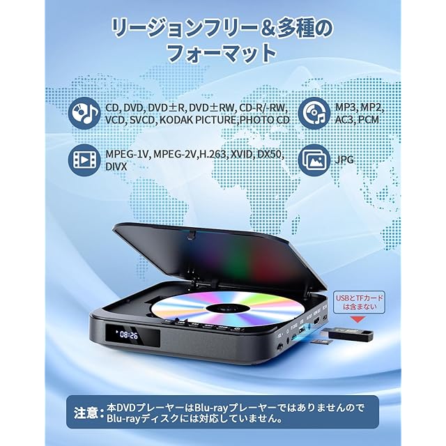 【リージョンフリー&広範な互換性】このDVDプレーヤーは、各地域や国のDVDディスクに対応し、CD、DVD、DVD-R/+R、DVD-/+RW、CD-R/-RW、VCD、SVCD、DVDレコーダーで録画したディスクなどを再生できます。また、AVI、DIVX、MPG、FLV、VOB、MP3、MP2、PCM、JPGなど、多数のビデオ、音声、画像フォーマットにも対応しています。(※注意:本DVDプレーヤーはブルーレイプレーヤーではありません。ブルーレイディスクには対応していません。)