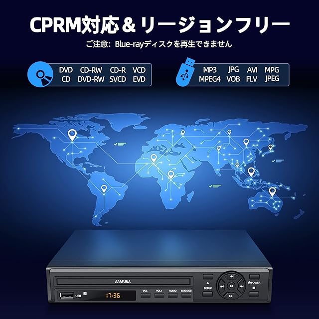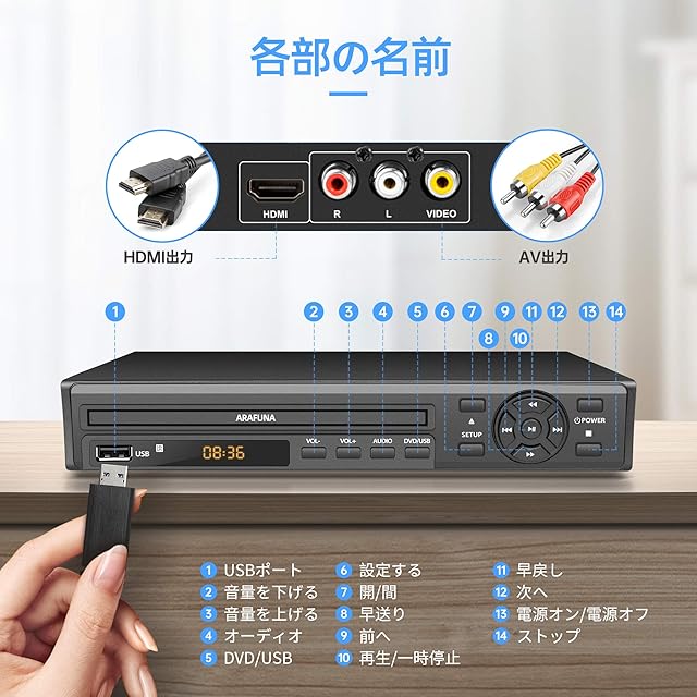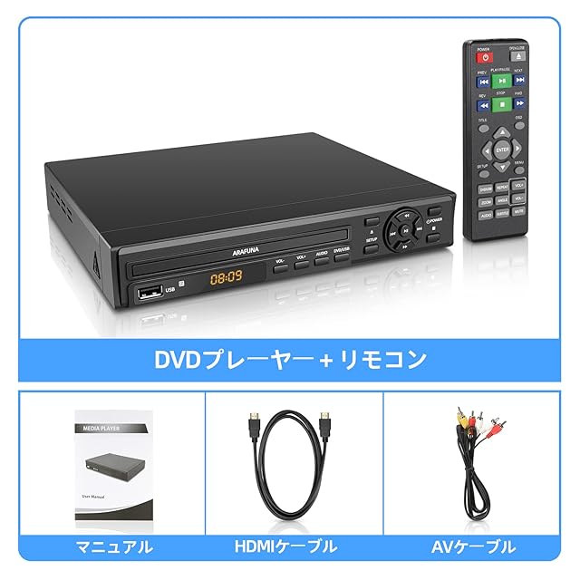 商品名:DVDプレーヤー 1080Pサポート ARAFUNA リージョンフリー 再生用 dvd プレーヤー DVD/CD/SVCD/VCD/MP3ディスクプレーヤー CPRM対応 HDMI出力 dvdプレーヤー 録画 番組 テレビ 地上デジタル放送 テレビ/プロジェクター接続可能 Blue-ray非対応 AVケーブル HDMIケーブル リモコン付き 日本語取扱書付き