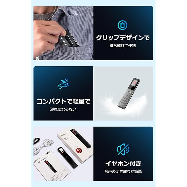 【録音機&イヤホン付き】軽量なボディ、わずか45.5g、ポケットに挟むのに便利なクリップも付いています。有線イヤホンも同梱されています。日付設定は可能で、特定の録音ファイルに日付を関連付け、データの整理と検索を容易にします。パスワードの設定も可能です。個人情報や重要な録音データを保護し、安心して使用できます。お気に入りの音楽をボイスレコーダーに保存し、MP3として再生もできます。軽量で多機能、どんな場面にも対応できます。