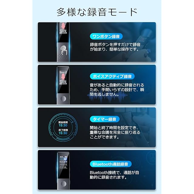 【ICレコーダー&多機能】スマートな録音、ワンボタンで押すと開始します。ボイスレコーダーは、ワンボタン録音、タイマー録音、VOR録音など、多くの機能を搭載します。ボタンをタッチするだけで録音を開始または停止でき、使いやすいです。タイマー録音機能は、必要に応じて録音タスクを予約し、重要な瞬間を見逃しません。VOR録音は音声をスマートに認識し、自動的に録音を開始します。さらに、Bluetoothペアリングした後、通話内容を自動的に記録し、これで、録音はよりスマートで便利になりました!