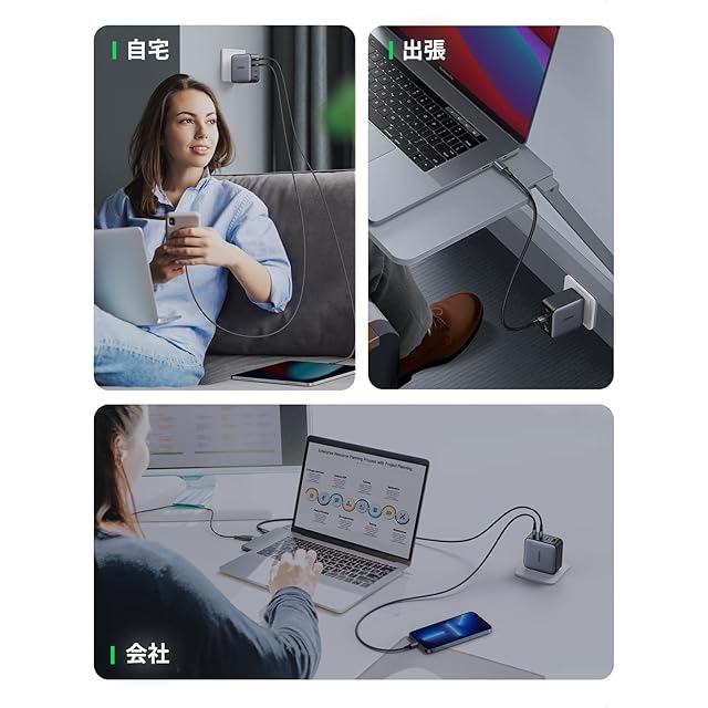 【GaN搭載・コンパクト設計】Type-C x3・USB-A x1 合計4ポートを搭載。シングルポートモードでC1 / C2ポートから最大100W、2つのUSB-Cポート使用時はMacbookProを65W、スマホやタブレットを最大30Wで充電できます。窒化ガリウム(GaN)技術を採用することで高出力かつコンパクトな設計を実現。また、100~240Vの電圧に対応しており、海外へ出張や自宅・職場・旅行など、様々な場所への携帯にも便利です。