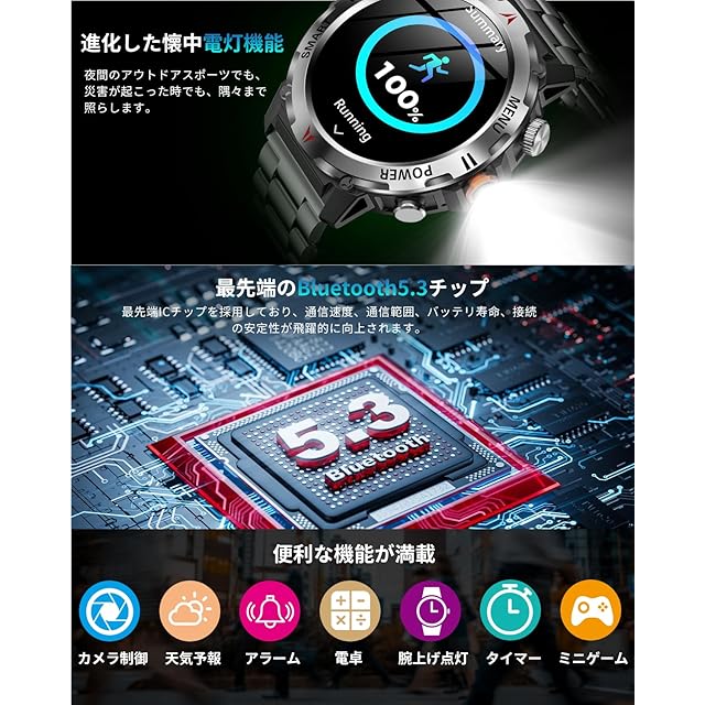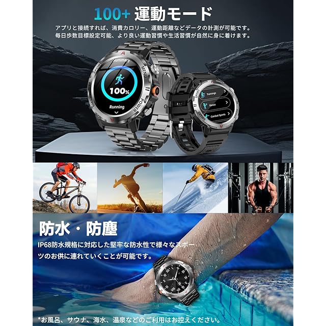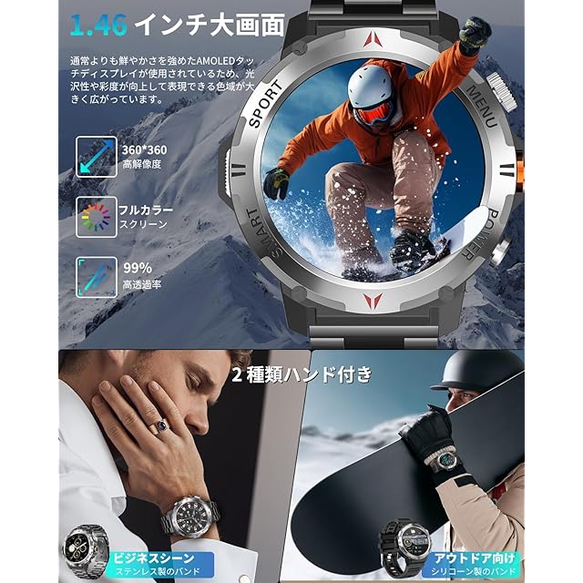 【IP68防塵防水&軍用規格スマートウォッチ】このスマートウォッチは業界最高水準のIP68防塵防水機能を実現、水や汗による故障の心配なく利用できます。本スポーツウォッチは屋外や、粉塵の舞う製造工場で使用することができ、防塵防滴、耐衝撃、耐高温/耐低温性能などの頑丈設計を行い、多くの軍用標準テストに合格することができます。また、高精細で美しい色を表現できる1.46インチタッチディスプレイを搭載し、視認性に優れた高解像度大画面を採用され、画質がより鮮明になり、より高精度な大画面で文字を表示されます。例のない快適な視覚感と優れた操作感をもたらします。※お風呂、サウナ、海水、温泉などのご利用はお控えください。
