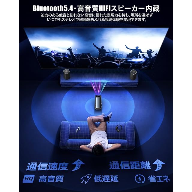 【超高速Wi-Fi 6・Bluetooth5.4・高音質HiFiスピーカー】ミニ天井プロジェクターは、独自の高精度チップ技術を採用し、超高速Wi-Fi 6接続を搭載していますので、2.4Gと5Gの両方の帯域に対応し、安定した信号と高速伝送を実現します。iOS、Android、Windowsデバイス(ミラーリング対応のスマートフォン、タブレット、デスクトップパソコンを含む)にWi-Fi経由で素早く接続し、スムーズで遅延のないオンラインゲーム、映画鑑賞、ビデオストリーミングを簡単にお楽しみいただけます。また、Bluetooth 5.4と高品質HiFiスピーカーを内蔵し、お気に入りのBluetoothスピーカーやヘッドホンからオーディオを再生することで、真に没入感のある3Dサウンド体験をお楽しみいただけます。