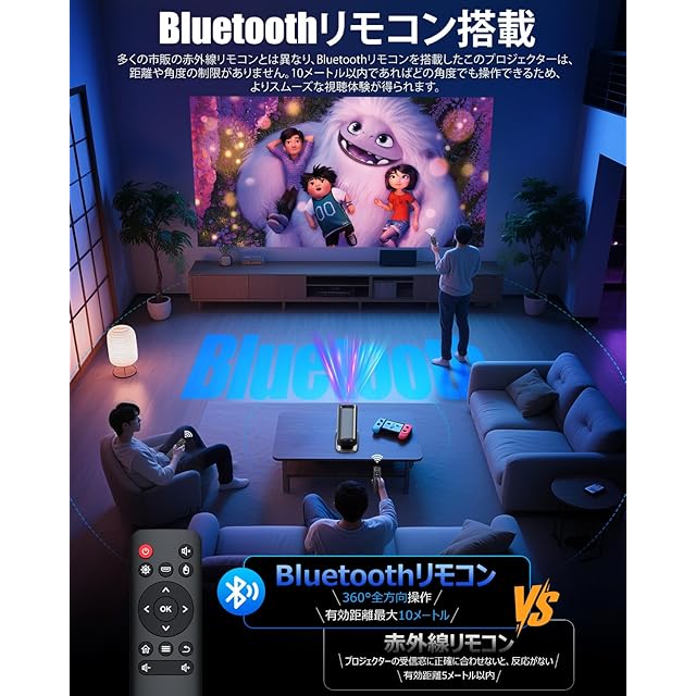 【Bluetoothリモコン・360°全方位調整&初心者向け】こんな悩みを抱えたことはありませんか?赤外線リモコンはプロジェクターの受信窓に正確に位置合わせする必要があり、近距離からしか操作できません。そうでないとリモコンが反応しません。また、赤外線リモコンは壊れやすいという問題もありました。このBluetoothリモコン付きプロジェクターはこれらの問題を解決します。距離や角度に制限がなく、10メートル以内のあらゆる角度からプロジェクターを操作でき、よりスムーズな視聴体験を提供します。そして、世界中の方々に優しいプロジェクターは、日本語、英語、中国語、スペイン語を含む82言語に対応しており、ニーズに合わせてお選びいただきます。また、詳しい日本語の取扱説明書も付属しておりますので、初心者の方でも安心してお使いいただけます。