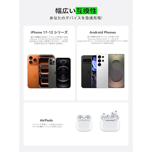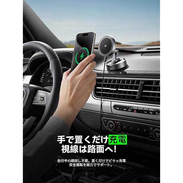 【取り外し可能なワイヤレス充電器——Qi2認証済み15W急速充電】この製品のワイヤレス充電パッドは両面にマグネット機能を備えており、車載ホルダーに取り付けて充電しながらナビを使用でき、また取り外して単独でも使用可能です。Qi2認証を受け、MagSafeにも対応しており、正確な位置に吸着し、安全かつ迅速に充電します。市場の7.5Wワイヤレス充電器と比較して、この製品は最大15Wの急速充電出力を提供し、充電速度は2倍速く、通勤中でも素早く充電できます。外側は強化ガラスとV0等級の難燃性材料を使用し、内部には優れた熱伝導性を持つグラフェン素材を採用し、複数の放熱構造で効率的に熱を分散します。デザインはスタイリッシュで高級感があり、厚さはわずか10mmで、軽量で持ち運びに便利です。旅行や出張に最適です。注意:最適な充電効率を得るために、18W以上の電源アダプターを使用してください(アダプターは別売り)。
