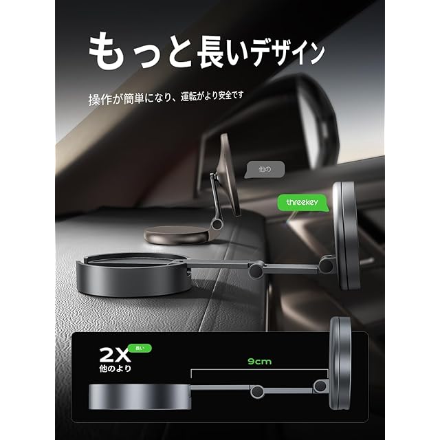 商品名:THREEKEY スマホホルダー 車 ワイヤレス充電 マグセーフ クルマ Qi2 充電器 車載【360°回転可能 高硬度亜鉛合金製の延長サポートアーム】MagSafe 車載 充電器 両面マグネット N52超強力磁石&3M製粘着剤 スマホスタンド 車 取付簡単 iPhone多機種/Galaxy S25 Ultraと多車種が対応 通勤·出張·旅行最適 (TZH101)