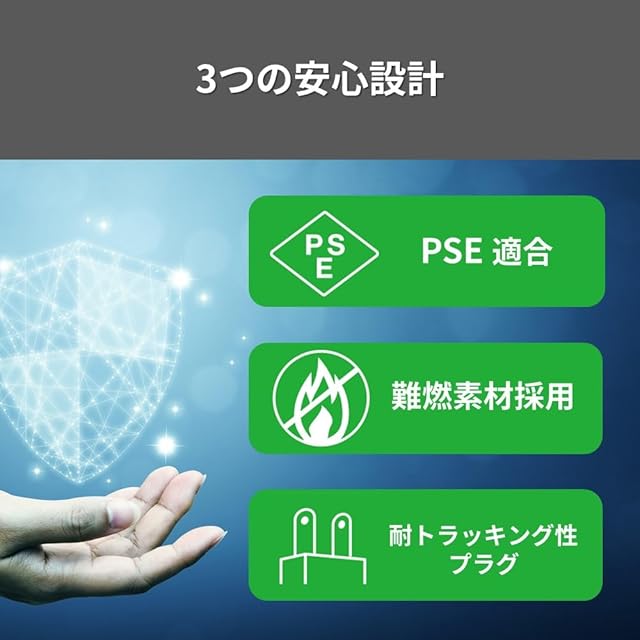 【安全設計】PSEに適合。燃えにくい難燃性素材の採用や、ホコリがたまっても発火しにくい耐トラッキング性プラグを採用しているので、安心してお使いいただけます。