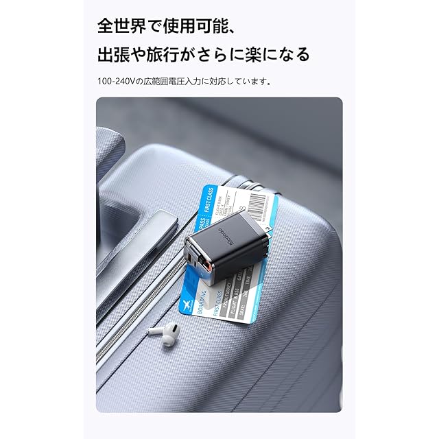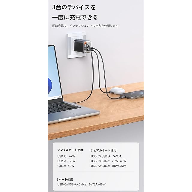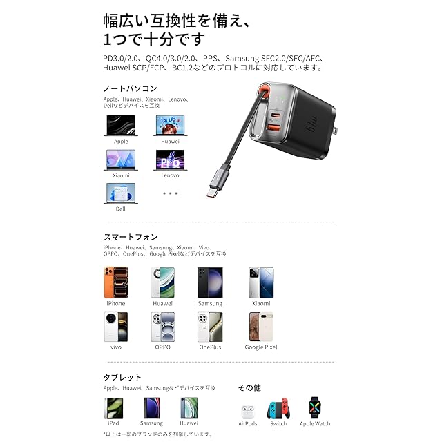 【幅広い互換性があり、1つでこと足りる】:PD3.0/2.0、QC4.0/3.0/2.0、PPS、Samsung SFC2.0/SFC/AFC、Huawei SCP/FCP、BC1.2などのプロトコルに対応。Apple、Huawei、Xiaomi、Lenovo、Dellなどのノートパソコンに対応。Apple、Huawei、Samsungなどのタブレットに対応。iPhone、Huawei、Samsung、Xiaomi、Vivo、OPPO、OnePlus、Google Pixelなどのスマートフォンに対応。Switch、腕時計、ヘッドフォンなど、その他のデバイスにも対応。※上記は一部のブランドのみを列挙しています。【3台のデバイスを、同時にフル充電できる】:同時充電時には、インテリジェントに電力が配分されます。単一ポート使用時:USB Type-Cポート:67W、USB Type-Aポート:30W、自動巻き取り式ケーブル:60W(USB-C伸縮式ケーブルは、最大対応60W出力について、これはAppleデバイスを対象とした仕様です)。2つのポートを使用する場合、USB Type-C+USB Type-A:5V/3A。USB Type-C+自動巻き取り式ケーブル:20W+45W。USB Type-A+自動巻き取り式ケーブル:18W+45W。3つのポートを使用する場合。USB Type-C+USB Type-A+自動巻き取り式ケーブル:5V/3A+45W。