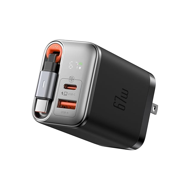 Mcdodo 67W 急速充電器 PD充電器 Type-C充電器 USB-C & USB-Aポート搭載【伸縮式USB-Cケーブル付き/出力デジタル表示/新GaN技術】iPhone 17充電器 折り畳みプラグ PD3.0/QC4.0/PPS等規格対応 MacBook iPad iPhone 17/16/15/14/13/12/11シリーズ/Airなど Galaxy Xperia Android スマホ ノートPC 他機器対応 PSE技術基準適合 ブラック